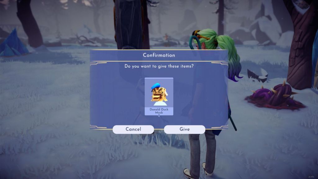 Bring the cutouts to Olaf and he will tell you to check on Anna to see how the Donald Duck Mask is coming along. Talk to Anna and she will give you a list of items that are needed to make the mask. You will need the following items: