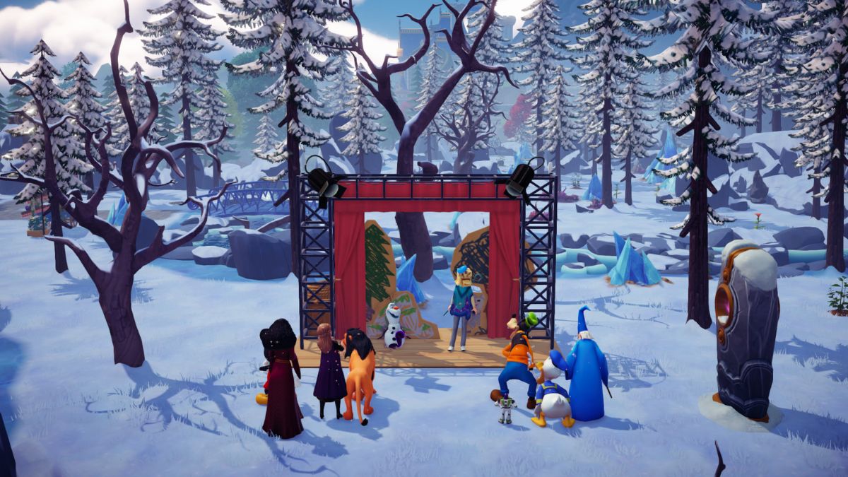 With nobody else able to play the role, it is up to you to put on the Donald Duck Mask and assume the role. Talk to Olaf with the mask on to rehearse your lines. After your rehearsal, Olaf will give you the stage. Place the stage wherever you want in the Frosted Heights and take a photo of everyone around the stage. Talk to Olaf afterward to complete the quest.