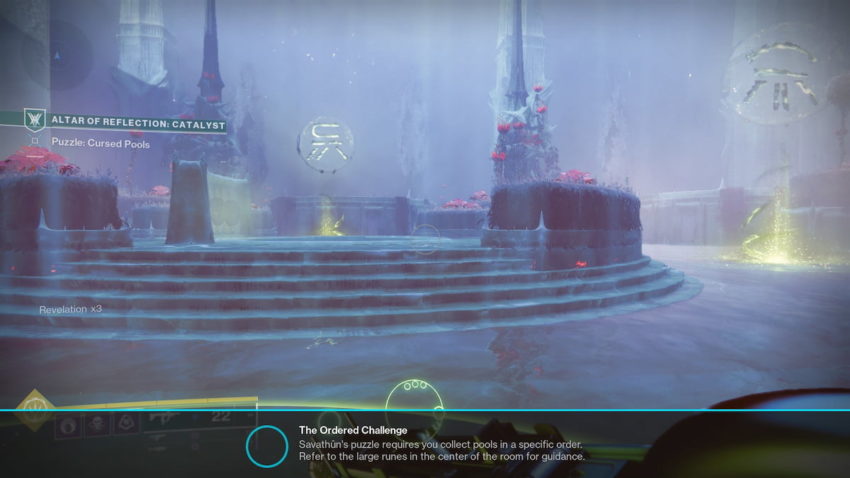 You’ll work your way through the Cursed Pools puzzle while at the Altar of Reflection, which will be available after finishing The Witch Queen expansion, and you’re working your way through the additional content. Here’s what the Cursed Pools puzzle looks like when you’re working on it.