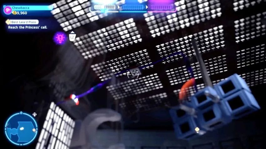 Once you’ve tricked the Imperials into powering up the turbolifts (ideally without being detected, so you can complete the Your Weapon, You Will Not Need It Challenge), you’ll activate the detention block elevator and ride it up to the detention center. The captain of the detention block guards will tell you to open the detention center and get the Wookiee secured. At this point switch to Chewbacca (or any Scoundrel character you have with you), hold down the aim button, and look up at the machinery above the detention block guards’ heads.