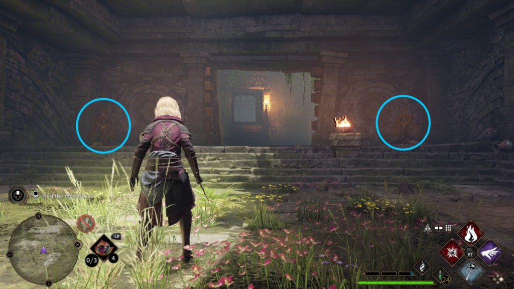 The next main room you enter will be the first puzzle in Hogwarts Legacy during “The Centaur and The Stone.” On both sides of the exit sit two Moth Rotators. To activate the mechanisms, you will need two Moths. After glancing around the room, you will notice several runic symbols on the walls. To open these walls and reveal their inner compartments, you must cast Accio on the rings above the walls with a single sign. Pulling out two horizontal columns of a certain symbol will open the wall with two identical runic markings. To get the Moths to solve the puzzle, open the second wall on the left and the first wall on the right.