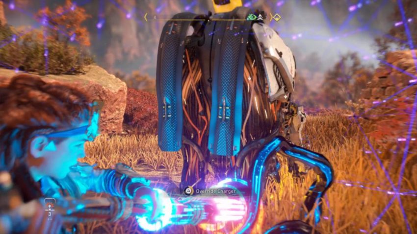 To override a Charger, sneak into the Charger site from the north, where there’s a lot of tall grass to hide in. The game will give a tooltip telling you that you can use a power attack to knock down a Charger, then override it when it’s knocked down. But you can also just sneak up behind one and stealth override it. Mount your overridden Charger then be on your way (tap X a few times to speed your mount up).