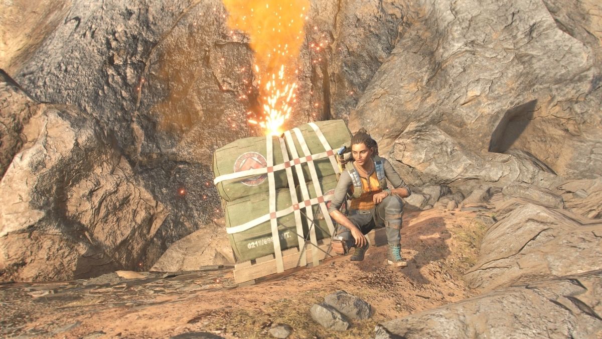 Before crossing the gap, use one of your guns to shoot the barrier that is holding back the rocks. This will cause the rocks to fall and reveal more climbing ledges. Use those ledges to reach the supply drop on the mountainside.