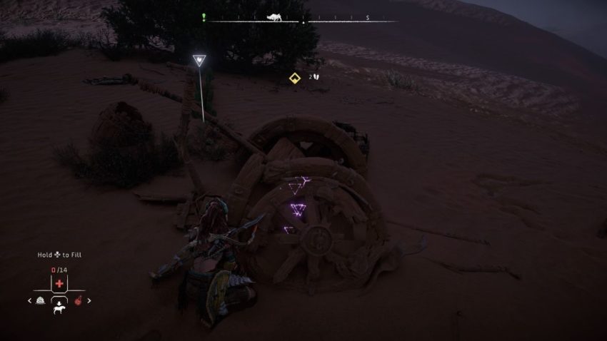 Once all the items have been examined, a Burrower will appear. Destroy it and wait for a Scavenger to come by. You will need to hide in the tall grass while you wait for one. A Sunwing will soon come by and pick up the Burrower’s body. The Sunwing will take the body back to its nest. After it drops the body, go in and loot the nest. Be careful not to get spotted until you reach the nest. With the nest looted, head back to Runda for your reward.