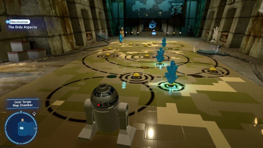Once inside, you’ll find that the secret room holds a Kyber Brick that is locked behind a cage — meaning there’s yet another puzzle to do. To open the cage, the diamond shards lying around the room will need to be placed in a particular order on the floor’s map. You can start by placing one shard on the round, yellow lego furthest from the Kyber Brick.