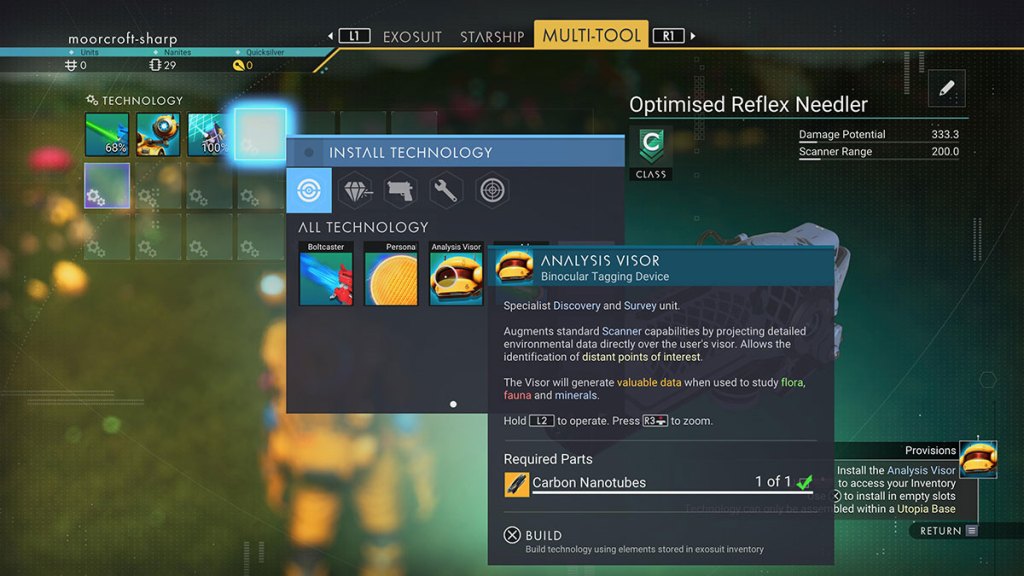 To install the Analysis Visor, you need one Carbon Nanotube. To craft this, you need to collect 50 Carbon and install the Visor in your Multi-Tool. Note that you get the plans for the Analysis Visor by completing the Foundation Milestone in this Expedition, so go back and complete it if you haven’t yet.