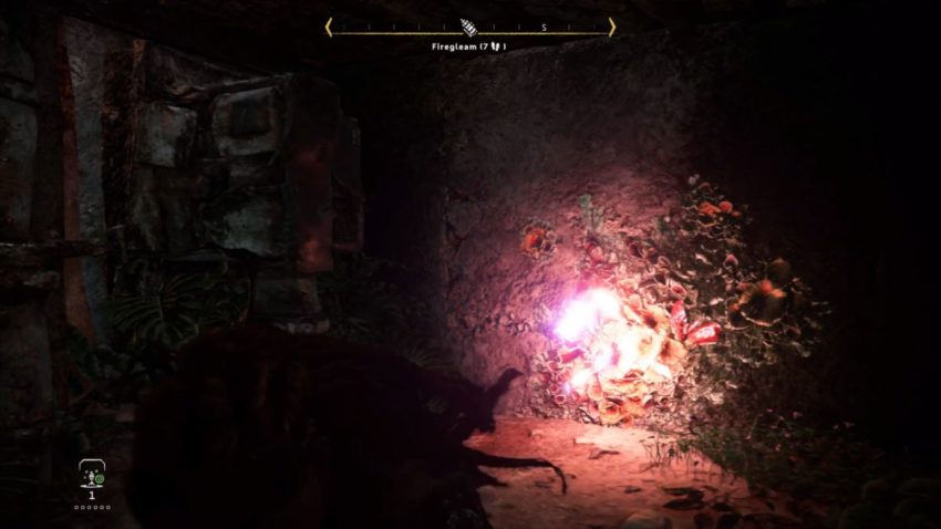 Inside the ruins, go to the eastern end of the north wall, and you’ll be able to climb up onto a platform. From there, make your way acrobatically along the east wall, and drop off the yellow rails at the end. Ignite the Firegleam, then go through the hole you just made and turn around. Use your Pullcaster to pull the switch to the south, then quickly grapple up to the old light that appears above you and, just as quickly, tap Circle to leap to the platform opposite before the light goes back around the rail. It might take a few tries before you do it fast enough.