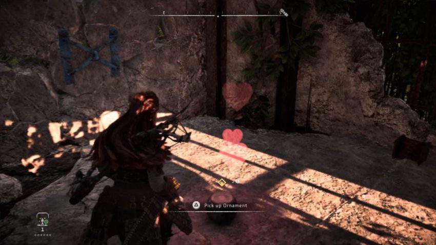 Hit the button inside the elevator, and ride it to the upper floor. Pull the crate out of the elevator, then release it and go south, then west around the outside of the elevator. Climb up the corner of the building, and Aloy will spot an Ornament. Go around to the northeast corner of the tower, then jump off to the east and activate your Shieldwing. Land at the second crate, then ignite the Firegleam up the slope to the west. Push the crate up the slope and through the hole left by the Firegleam, then push it off the edge of the upper floor.