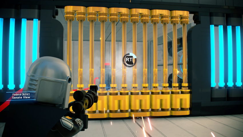 After you jump down below, make sure you have a Bounty Hunter character. You’ll need them to shoot and destroy the gold object protecting access to the lever.