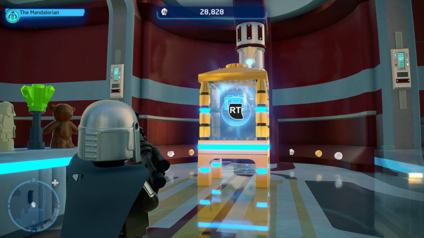 Next, step inside the building, and a gold object is protecting the Kyber Brick. Again, you’ll need a Bounty Hunter to destroy it, and you can grab the Kyber Brick.