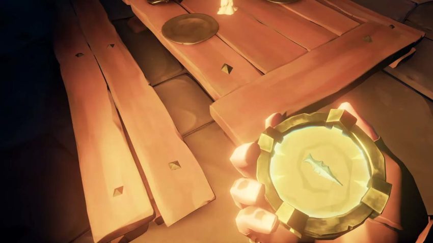 Once you’ve dropped anchor and disembarked at Golden Sands Outpost, you and your crew will need to pass through an abandoned outpost and head for The Captain’s Head Tavern. To your right inside the tavern is the Shrouded Compass, which will lead you to the Crescent Isle, so you best be getting ready to set sail again.