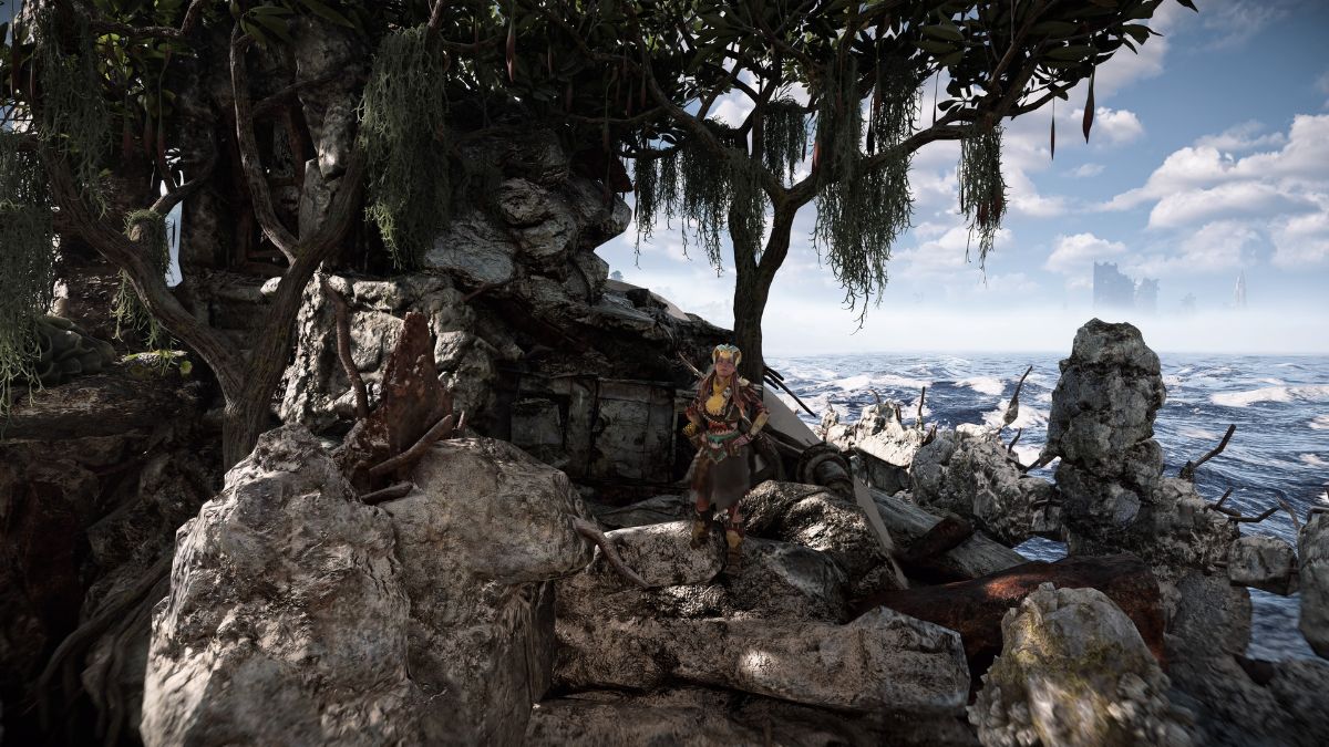 After receiving the contract, make your way northwest of the Salvager camp. You will hit the ocean. Be prepared for a long process if you don’t have a breathing mask. Swim out to the small ruins off the coast. You can take refuge here from the machines if they get in your way or if you need a break. Dive into the water to find the parts needed for the armor.