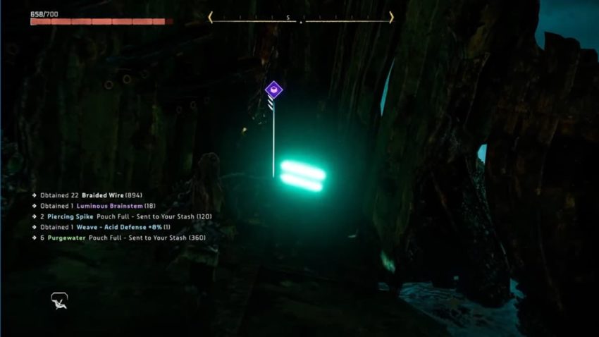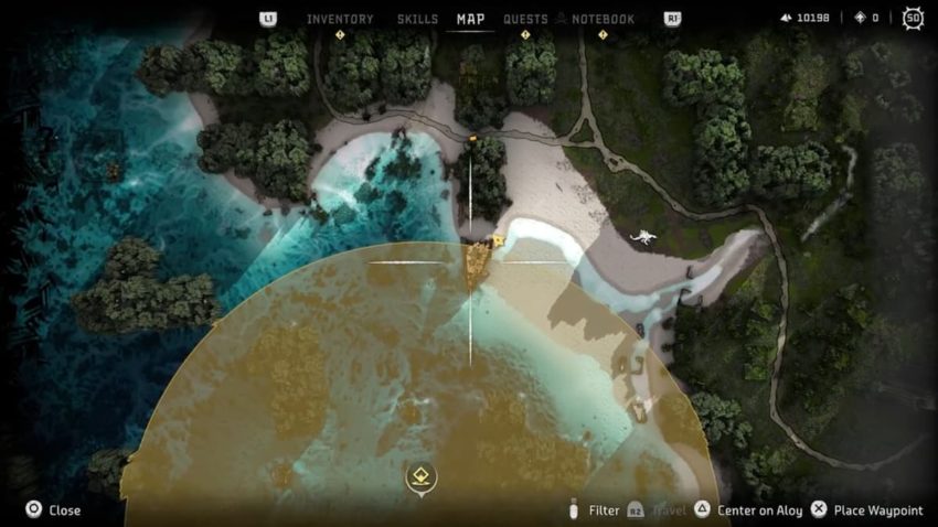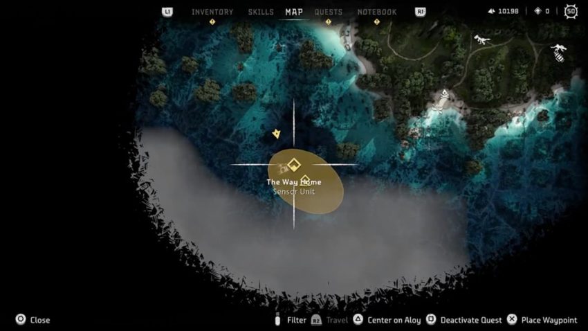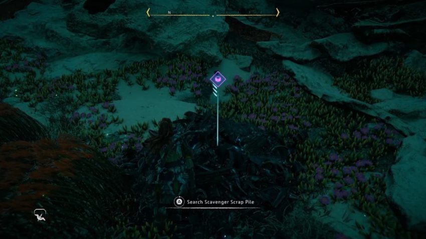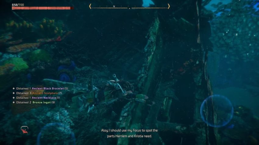 Go to the shipwreck, and Aloy notices she can not find the Gyrocompass. Make your way towards the middle of the island and underneath a piece of broken ship is a scrap pile that shows a purple item in it when you scan with your focus. This is the Gyrocompass, but it’s broken.