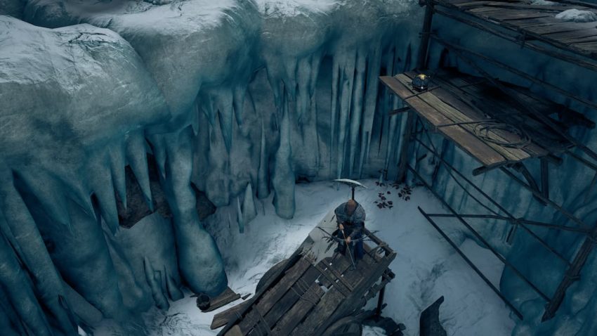 After you enter the tomb, you need to be wary of a steep ice drop-off when entering. If you can time it carefully, fall off the side of the ice and then jump onto the first platform. You can make your way to the bottom by jumping from the various platforms before reaching the rocks and then arriving at the bottom.