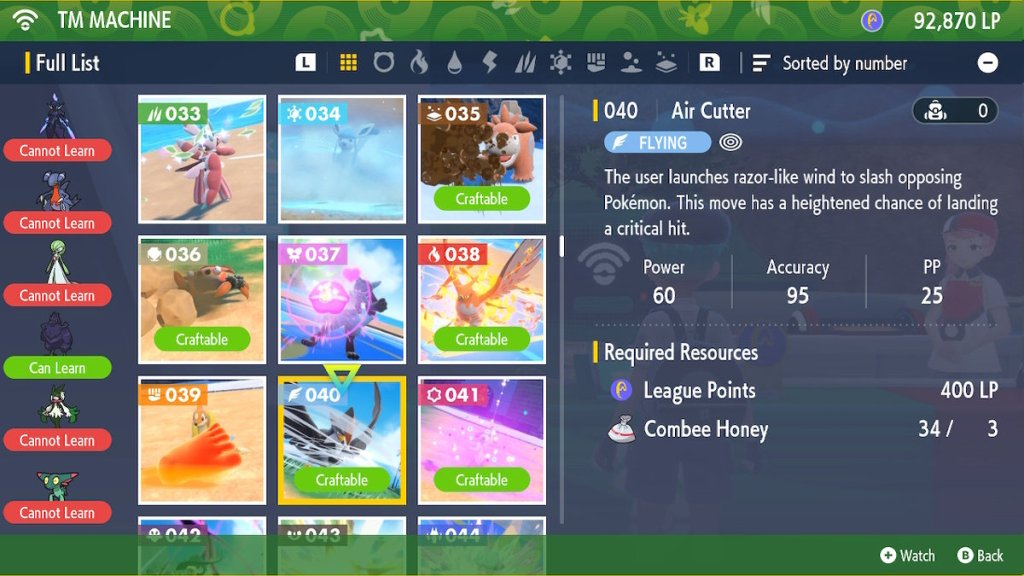 With the introduction of the Technical Machine (TM) crafting system in Pokémon Scarlet and Violet, trainers are now able to craft their own TMs using materials dropped from wild Pokémon. Air Cutter is one of the many craftable TMs in the game. As a Special move with a base power of 60 and a base accuracy of 95, Air Cutter’s true value is its increased critical hit chance, allowing Pokémon like Togekiss to capitalise on it with its Serene Grace ability. Here is how you can craft TM 040 Air Cutter in Pokémon Scarlet and Violet.