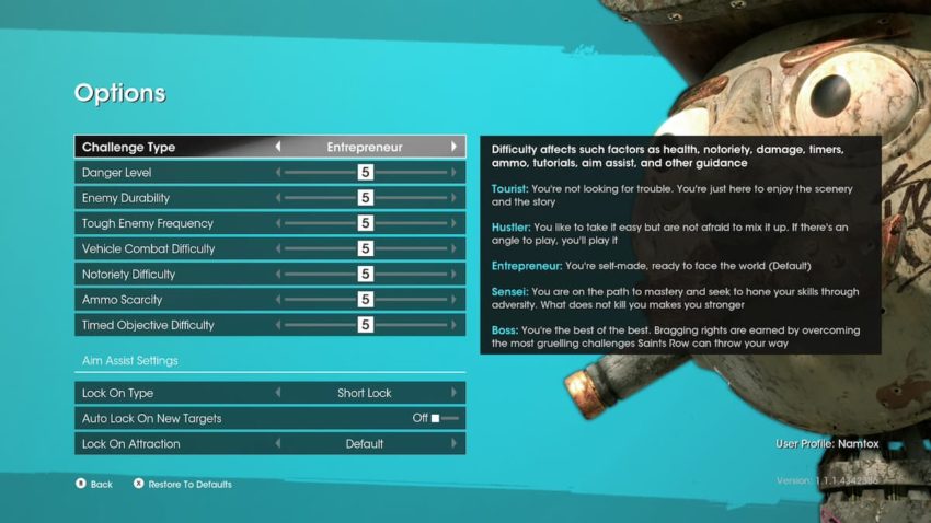In Saints Row, you can access a wide range of accessibility options. These options range from lock-on assistance, camera motion, and automatic quick time events. The headliner in the accessibility section is the new Challenge setting. Challenge is the term for difficulty level in Saints Row and features several presets. Tourist, Hustler, Entrepreneur, Sensei, and Boss. These range from very easy to very hard.