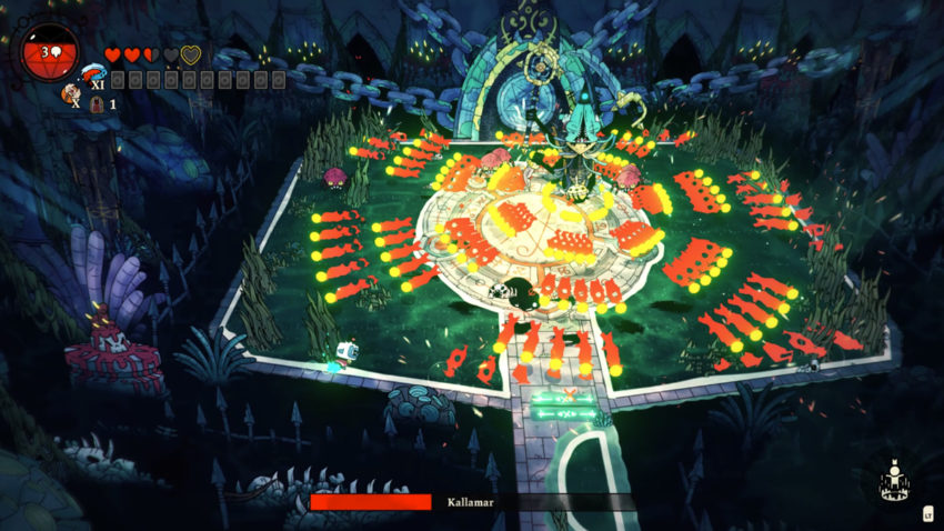 When his health is low, Kallamar will gain some new fireball patterns. The first is three rings of fire that get thrown your way — stay moving to avoid getting burned. He also gets two more bullet hell patterns. The first, pictured above, sends out fireballs in waves. If you step back, you can see that there are safe lanes between the fireballs, so stick to those to stay healthy. Lastly, he can emit a full ring of fire with no gaps, so be ready to roll right through it.