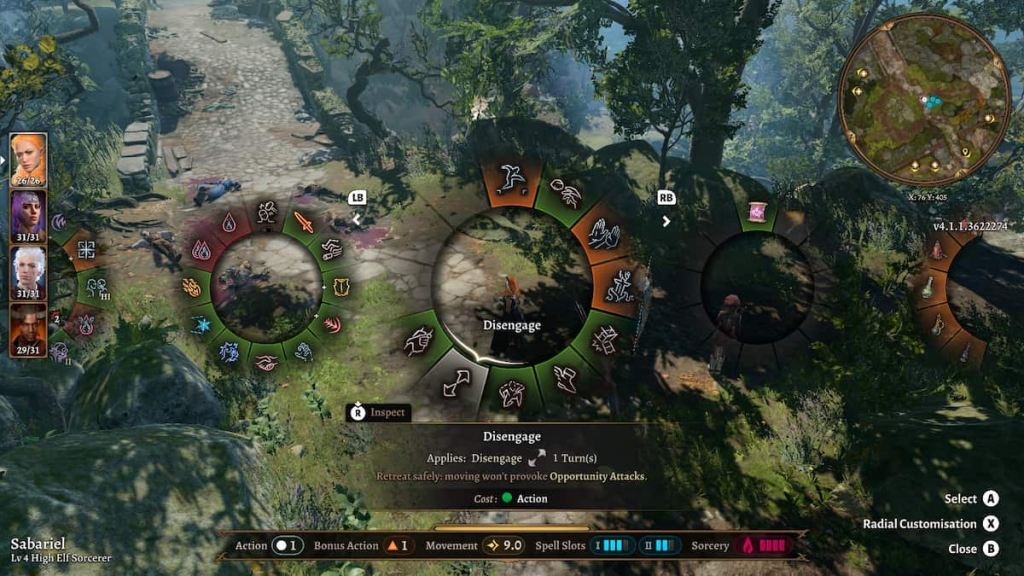 If you’re playing Baldur’s Gate 3 on a controller, press L1 or R1 to bring up the action wheel. You will likely have several action wheels and must press L1 or R1 to cycle through them. You should find the Disengage action listed alongside Hide and Dash, with its icon resembling two arrows pointing away from each other, as demonstrated in the screenshot above.