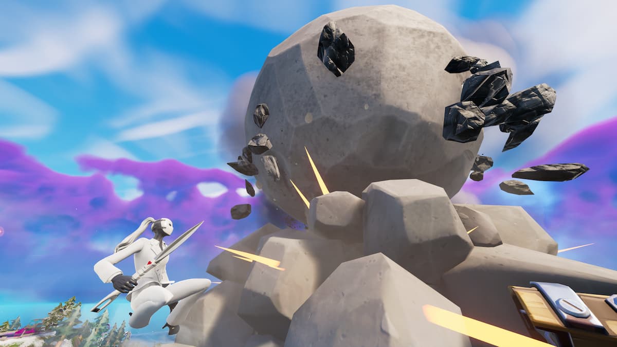 Of course, the first step will be to locate a Runaway Boulder on the battle royale map. There are several scattered around, but they predominantly spawn on top of the snowy mountains in the northwest region near Rave Cave and Logjam Junction. Additionally, you can spot which rocks are Runaway Boulders by seeing if smaller pebbles surround the structure.