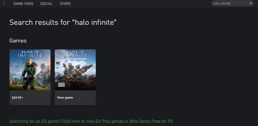 After you have both of those things and have your Xbox PC application set up, navigate the application and start it. Once you’re on the application page, go to the search bar at the top right, and type in ‘Halo Infinite.’ It may take a few seconds to load. Next, you should see a Halo Infinite page with the official game and the game’s multiplayer.