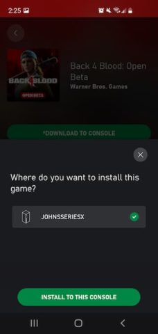 Sign in to the app with the Xbox account that has pre-ordered the game. Search Back 4 Blood, and you will find an open beta client. Select Download to Console and choose the console you will be playing on. If that console is turned on or in rest mode, it will begin downloading the game.