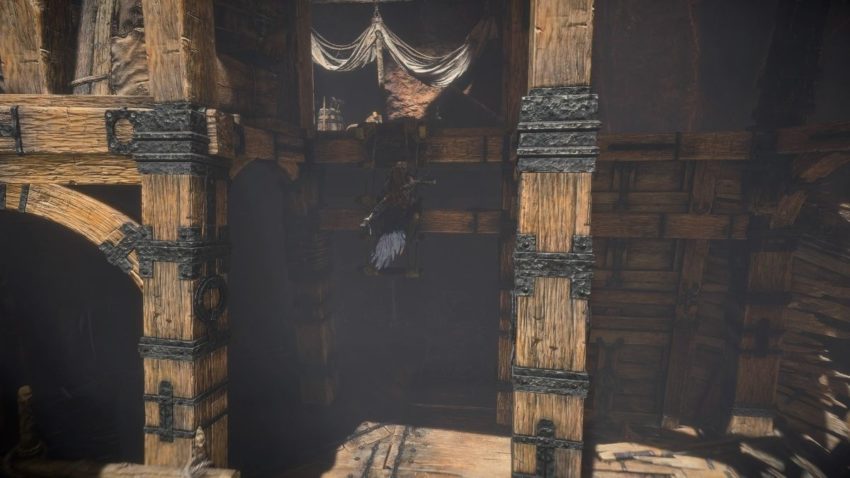 Knock down the ladder in case you fall in the water then use your Pullcaster to pull the beam over to you. Climb onto the beam and climb up the ledges to reach the explosives on the track above. Press the triangle button to interact with the explosives. This will initiate a cutscene where the bombs explode and drain the mines. Be careful of the machines that spawn afterward.