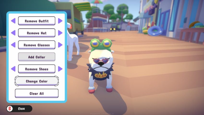 From this menu, you can change the dog’s outfit, hat, glasses, collar, and shoes. There’s even an option to change the color of most clothing items. Certain outfits such as the Dachshund’s hot dog bun only come in one color. The same applies to some hats. The color options themselves are limited and apply to the entire look. If you try equipping different clothing items piece by piece, their color changes after re-equipping them. Some articles of clothing also cancel out others. An outfit and collar can’t be worn at the same time, for example.