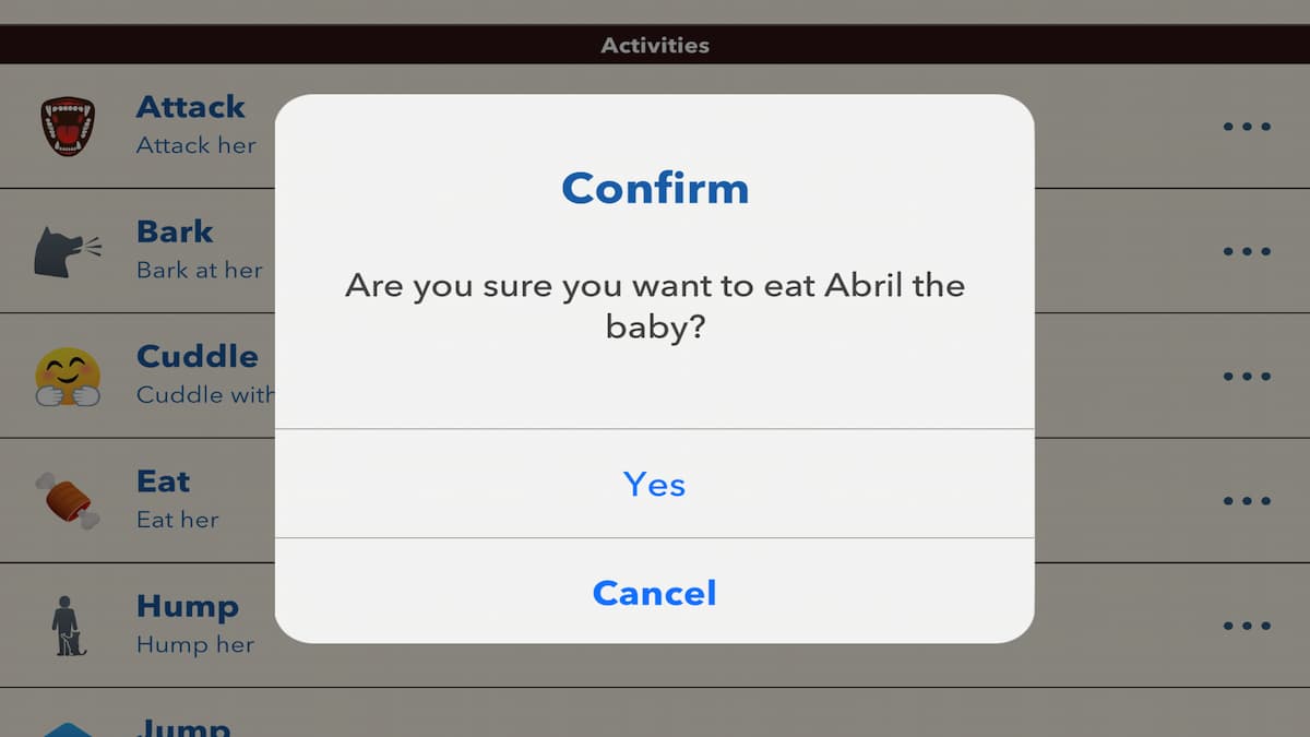 Once the infant of your unnecessary wrath has made its existence known, all you need to do is enter the family menu and select them. Once you have chosen the infant family member, you will see the “Eat” activity. If you choose this activity, you will be prompted with a pop-up asking if you are sure this is what you want to do. Upon confirming your intent to do this questionable deed, the results will follow, telling you the outcome and fate of the infant.