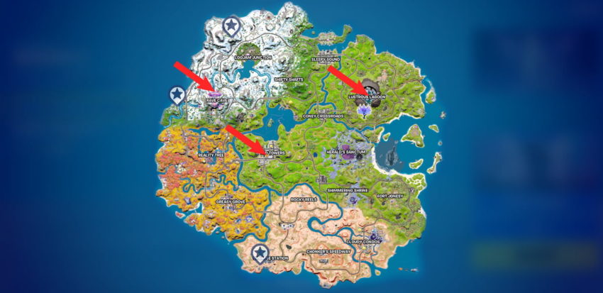 The Flairship, the Driftwood, and No Sweat Insurance are new locations you can visit on the map that are a part of the large POIs you can visit. You can find them while visiting the Rave Cave, Tilted Towers, and Lustrous Lagoon, which will take you all over the map in Fortnite. You do not need to complete this challenge in a single match, which means you can visit each location while playing different matches, making your work significantly easier, especially when trying to avoid other players throwing Chrome Splashes at you.