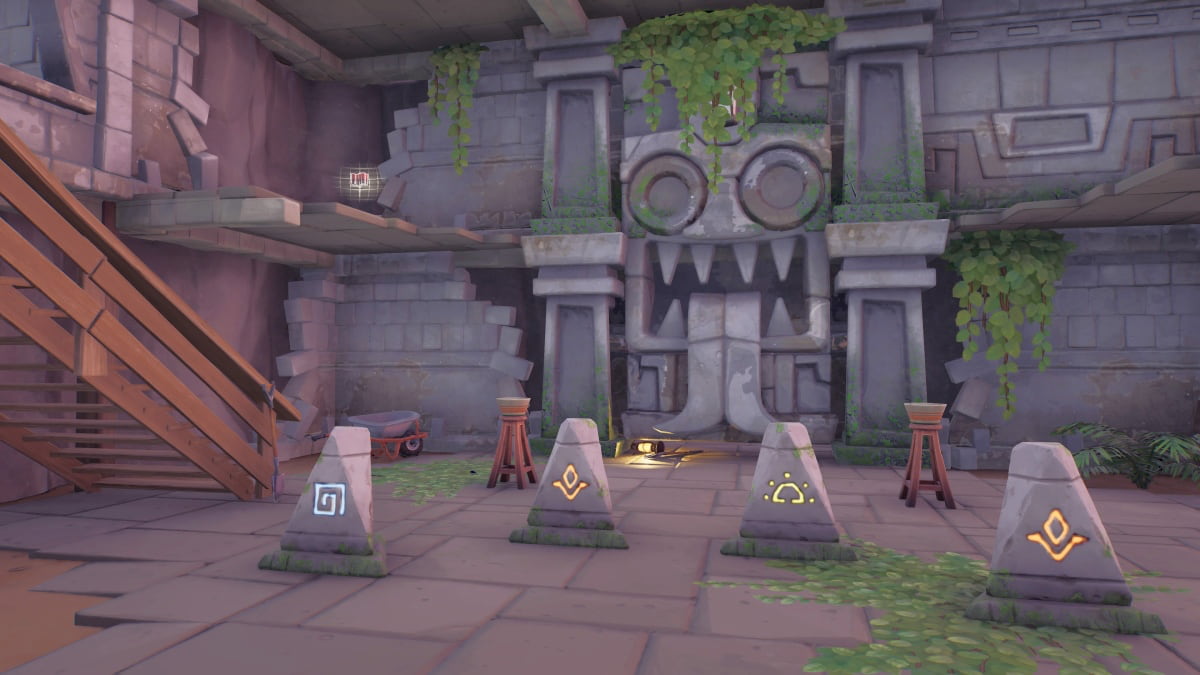 The main chamber can be located inside of a shine at the center of Shuffled Shrines. It is in this shine players will come across a monstrous door and four stones that display different symbols. This is actually the POI’s secret Indiana Jones puzzle in which players will need to scour the location to find the correct symbols and rotate the stones to display each one so that the door opens. Each symbol’s location can be found below and should be displayed in this order from left to right on the stones.