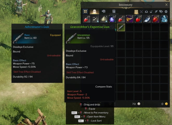 You need to open up your character’s inventory by clicking the I button on your keyboard. Your backpack menu will open up, showing you all of the items you can equip that you’re currently holding. Hover over the item you want to equip with your mouse, and you’ll be able to see its stats and compare to the item you currently have on your character.