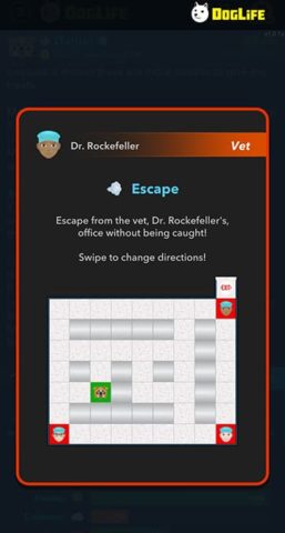 Unlike escaping a pet store or an animal shelter, this minigame plays similar to Pac-Man. As soon as you swipe, the vets will begin moving around the aisles to try and catch you. You will need to navigate yourself around and reach the exit without them touching you. Be careful; they are slightly faster than you, so take your chances to sprint for the door when you have the opportunity.