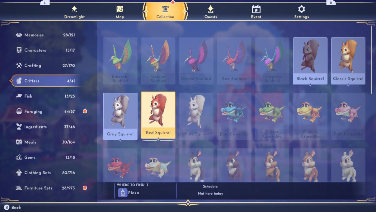 There are eleven different types of critters that you can find throughout the biomes of Disney Dreamlight Valley. Each of these critters is meant to be interacted with in a specific way. You can view all of the animals and their variants by going to the collections menu.
