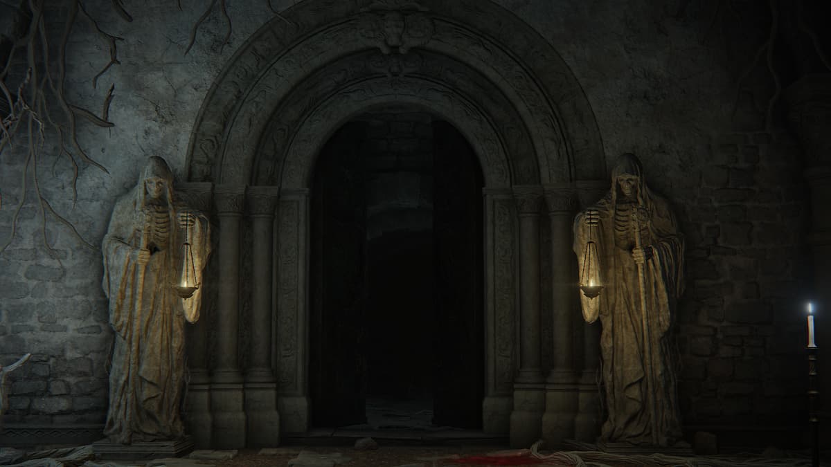 Head back to the falling blade’s room and wait for the middle blade to come down. Once it’s in the ground, stand on top of it and ride it up to the alcove above. Keep your guard up as you’re riding the blade, as the archer skeletons will take pot-shots at you the entire time. Kill this Gravekeeper before hopping back down and exploring the path at the end of the blade room.