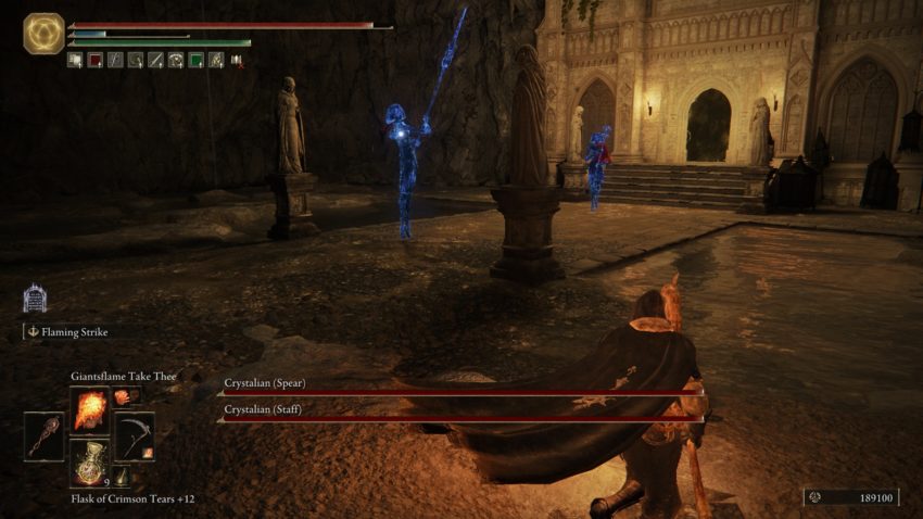 Let the Spear Crystalian get close and use jumping and heavy attacks to break its posture, allowing you to deal actual damage to it. Once the spear-user is dead, continually circle-strafe around the staff-user so its spells can’t hit you, being mindful of its AoE attack that has a long windup.