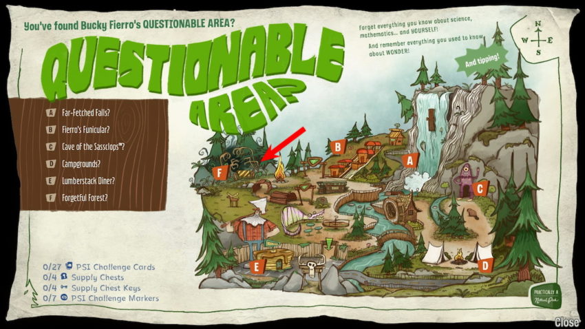 When you exit the Psychoislation facility, proceed to the right, and follow the path until you reach the entrance to the Blastcap Becky Cave. Next to the entrance is a small tree that you can bounce on to make it to the other side of the canyon. Along the way, Frazie, Raz’s sister, will be throwing things at him, and you’ll know you’re on the right track when this happens. Once you’re through the mines, you’ll arrive at the Questionable Area? map.