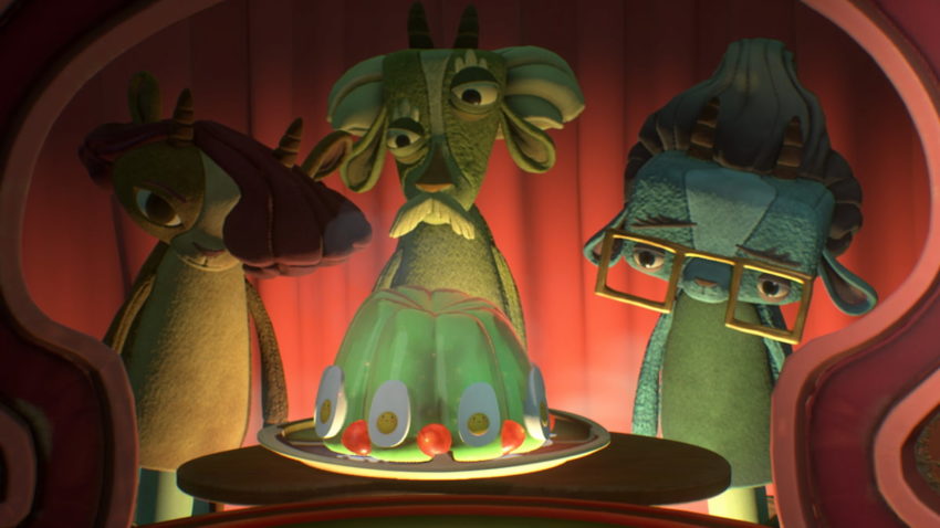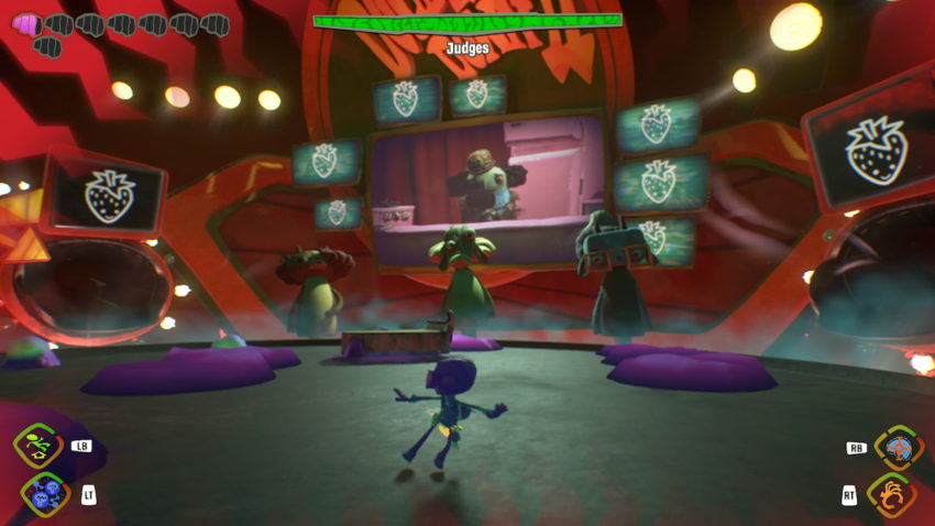 After completing all of the cooking challenges, you’ll have to battle against the three judges evaluating your meals. You’ll defeat them by serving them ingredients on their respective sides, and the only way to grab those ingredients is to pull them from the purple gunk that they fire out, the ones with black legs sticking out of them.