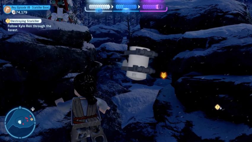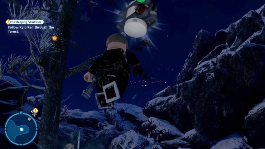 You can only get the third Minikit on Free Play. After you’ve fought Kylo Ren for a second time, and have been attacked by Snowtroopers (shoot them in the head to get the Keeping a Cool Head Challenge), a TIE Fighter will crash right in front of you. Instead of using its wing as a ramp, go to the right (east) and find three crates at the end of the path. Switch to a Jedi or Dark Side character, so you can use the Force to stack the crates, then jump up them to get the Minikit at the top of the tree.