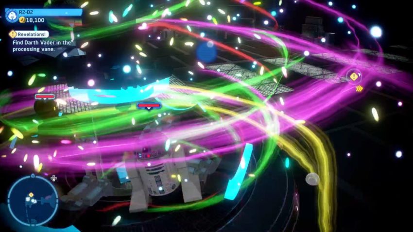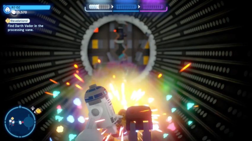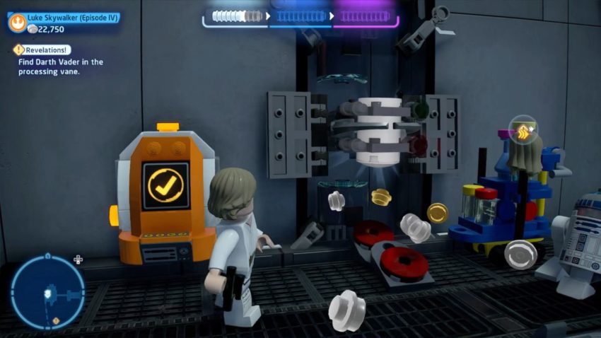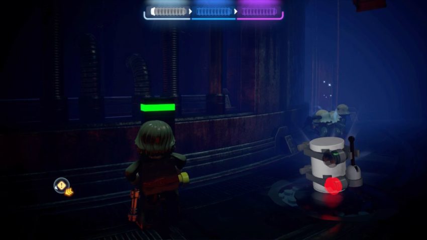 Next you’ll go through either the left pipe or the right pipe. On the other side, switch to R2-D2 and enter the middle pipe. Use the grapple to open the hatch in the top of the pipe to release the second Minikit.