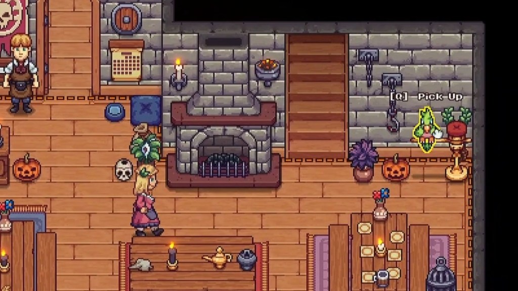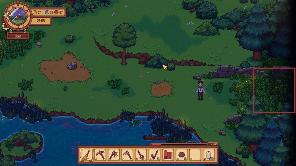 There is a hidden vendor that will only appear after 2000 on Wednesday and Thursday. If you have staff, you can easily walk over while the bar is open, although upset customers could harm your reputation as you aren’t there to quiet them down. Move south from the tavern, and find the pond with a dock near the bottom.