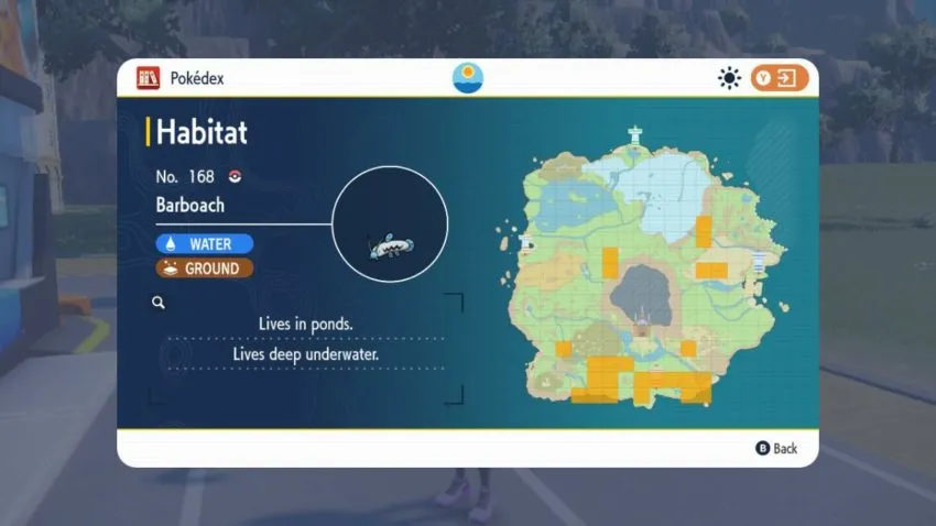 As you can see by Barboach’s habitat data, this pokémon likes to live in ponds around the Paldea region. Barboach will frequently dive underwater to avoid contact so it is best to interact with this pokémon from a distance by throwing a pokéball at it. The earliest you can find Barboach is in the ponds around Los Platos during the tutorial. Make sure to bring a pokémon who knows grass-type moves since Barboach is weak to grass attacks.