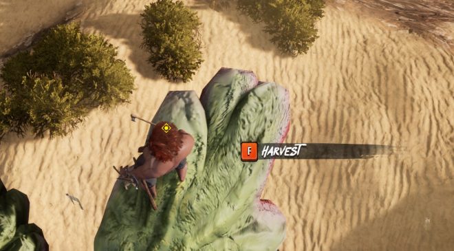 While on top of the cactus, look for the small, reddish items hanging off the sides of the large plant. You need to wait for the “harvest” icon to show up, and when that happens, you can obtain your precious cactus fruit.