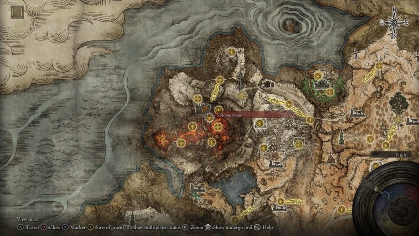 You will need access to the Volcano Manor, which is located to the west of the Altus Plateau. You can reach this area in a few ways: by heading north and then west following the road from the Altus Plateau Lesser Erdtree, by completing Rya’s questline (you can start this quest near the Telescope in the Liurnia of the Lakes very early on,) or by being kidnapped by an Abductor Virgin (at the Raya Lucaria Academy, ride the waterwheel all the way to the bottom and get grabbed by the Iron Maiden-looking enemies.)