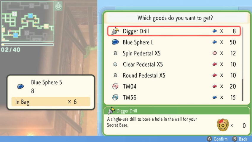 You’ll pull up the Hiker’s available inventory. They should have Digger Drills available for eight blue spheres. You can obtain these blue spheres by mining at the fossil points in the Grand Underground, which are the orange icons on your map. Approach these locations to start the mining minigame, and hopefully, you walk away with some spheres. You can find several unique spheres, such as Red, Blue, and Green.