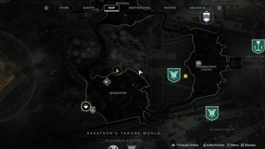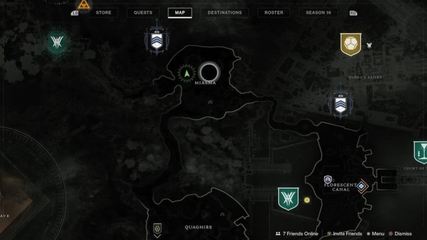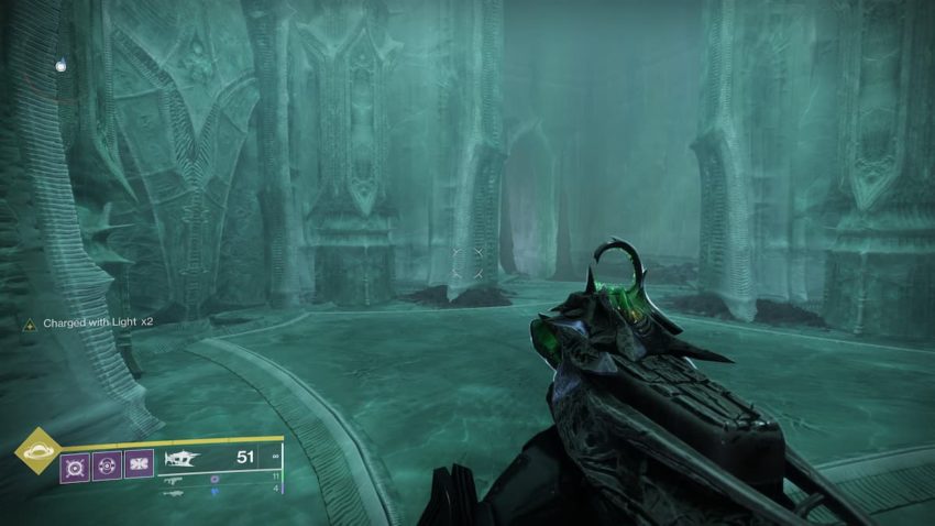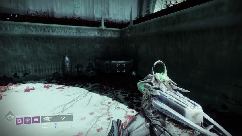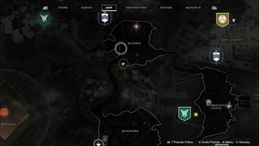 If the previous two locations don’t have the Deepsight you need, the last location sure will. Head into the Florescent Canal and look at the map and in-game shot above. This location has a lot of structures, so finding the Deepsight can be tricky. Same as before, scan the corpse after grabbing the Deepsight and follow the slime to the area shown in the map below. It’s inside a narrow hallway near the upper levels of the canal. Scan the debris, kill the Hive, and grab some Qualichor.