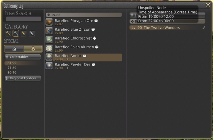 Next, open up your Gathering Log and click on the Special button on the left side of the menu. This should bring up your Collectables list, and at the bottom is your target. Click on it, and it will notify you that you can only obtain Rarefied Annite from 10:00 to 12:00 and 22:00 to 00:00 Eorzea Time, in The Twelve Wonders, Elpis.