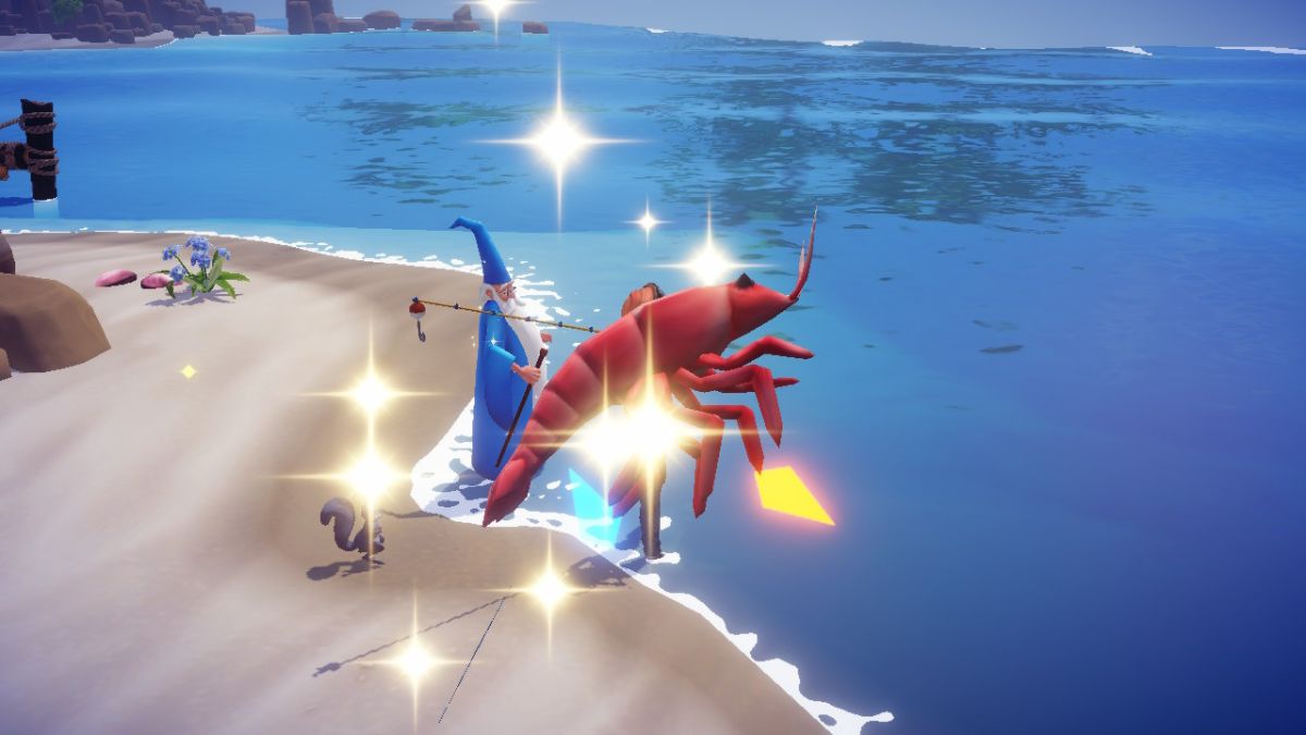 Dazzle Beach is the biome connected to the Peaceful Meadow and is also the location where you can find the Orb of Power hidden within the mysterious cave. Opening the way to Dazzle Beach will cost you 1,000 Dreamlight. The ocean here is where you can find Shrimp. Unfortunately, it is not as easy as casting your fishing line in the water.
