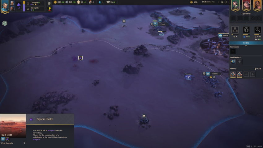 You’ll need to find a Spice Field. Without one, you will not be able to harvest any spice whatsoever. You can discover a Spice Field by sending your Ornithopters out on recon missions, discovering more of the map you’re playing. When you find a Spice Field, you’ll need to act fast to secure it before another faction can control that territory. Luckily, the Spice FIelds do not have limited quantities. To secure a Spice Field, you need to control the village associated with that region.