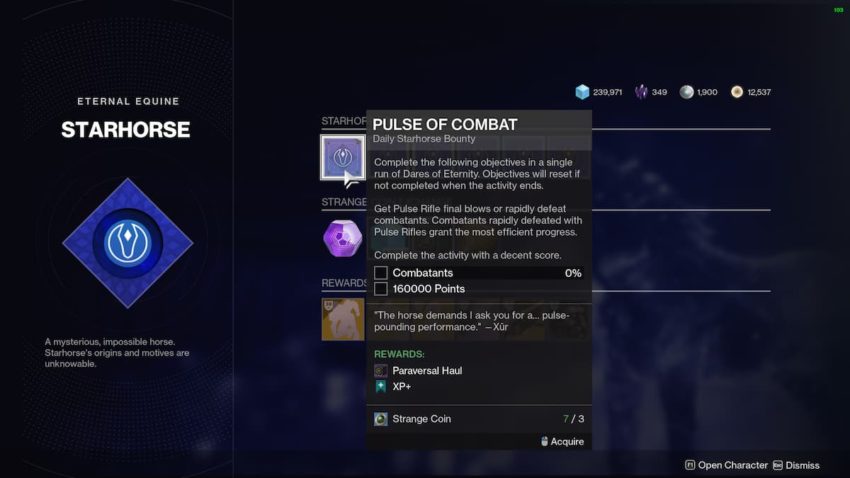The Strange Coins can then be used to purchase an assortment of Bounties or items from Starhorse at Eternity.