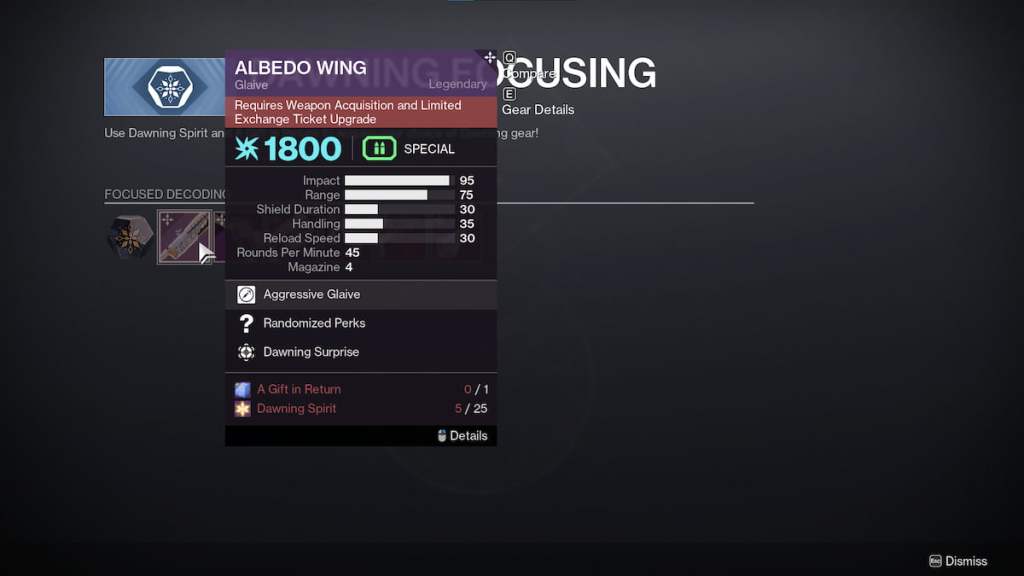After you have at least one A Gift of Return and a handful of Dawning Spirits, return to Eva to turn them in and receive your prize. The Albedo Wing in Destiny 2 is Dawning’s 2023 premier item, and it’s making its debut. It’s an Arc GLaive that goes in the Energy Weapons slot of your loadout. You can roll on an Albedo Wing as many times as you want, so long as you meet the resource requirements for Eva. However, you can always roll on the Festive Engram to earn the Albedo Wing or other weapons at a lower cost, but you’re not guaranteed to get the one you want.